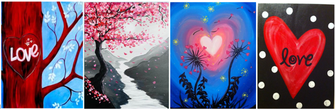 - What are we painting: Valentine's themed packets will be provided to choose a picture to create your canvas/wine glass paintings. You'll be painting with acrylic paint during our paint & sip event, and you will learn basic painting skills and build confidence in your newly created art.